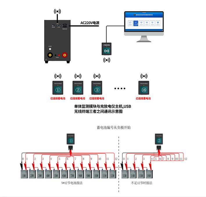 ? ? ? ?3、單體電壓采集盒與放電儀主機、USB無線終端,三者之間進行數據傳輸。
