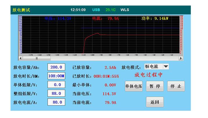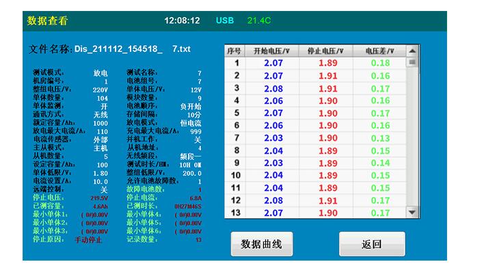 ? ● 放電可設定多個終止條件:放電容量到、放電時長到、單體電壓閾值 ,整組電壓閾值,其中任意一個測試條件達到后會自動停止放電,以及過電壓、過電流、過溫、數據存儲異常、電壓測試端子反接等多種測試故障報警顯示。